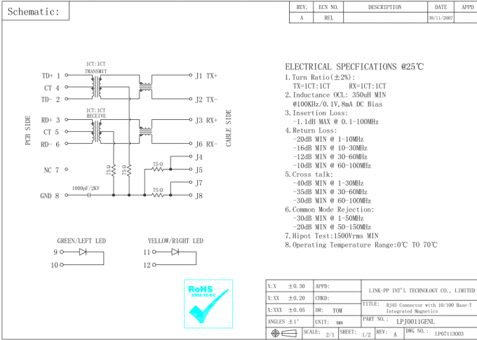 HFJ11-2450E-L12RL | LPJ0011GENL | LINK-PP | HFJ11-2450E-L12RL جاك Rj45 8p8c LPJ0011GENL 10 / 100Base-T درع مع المصابيح |